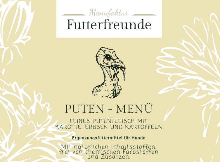 - 62 % Pute (Putenmuskelfleisch, Putenmagen, Putenherz, Putenleber), 23 % Kartoffeln mit Schale, 15 % Erbsen und Karotten