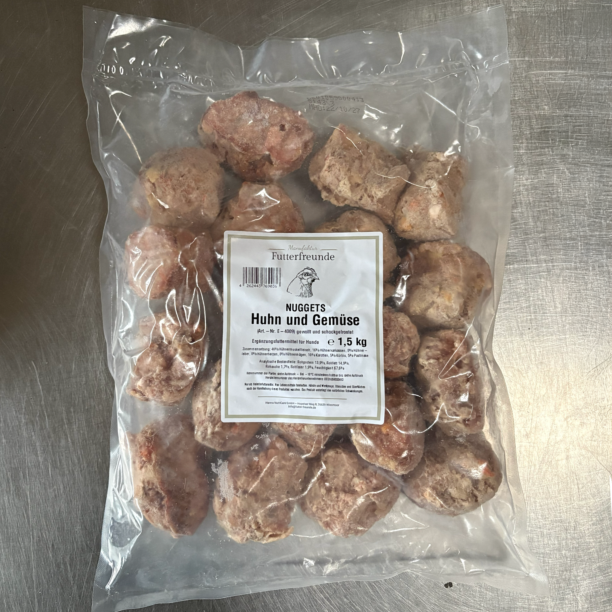 Unser Huhn-Menü mit Gemüse in praktischen 75g Pellets vereint hochwertiges Geflügelfleisch mit frischem, saisonalem Gemüse wie Kürbis und Karotten. Dieses ausgewogene BARF-Produkt bietet eine natürliche Mahlzeit für Ihren Hund, reich an leicht verdaulichen Proteinen und wichtigen Nährstoffen.