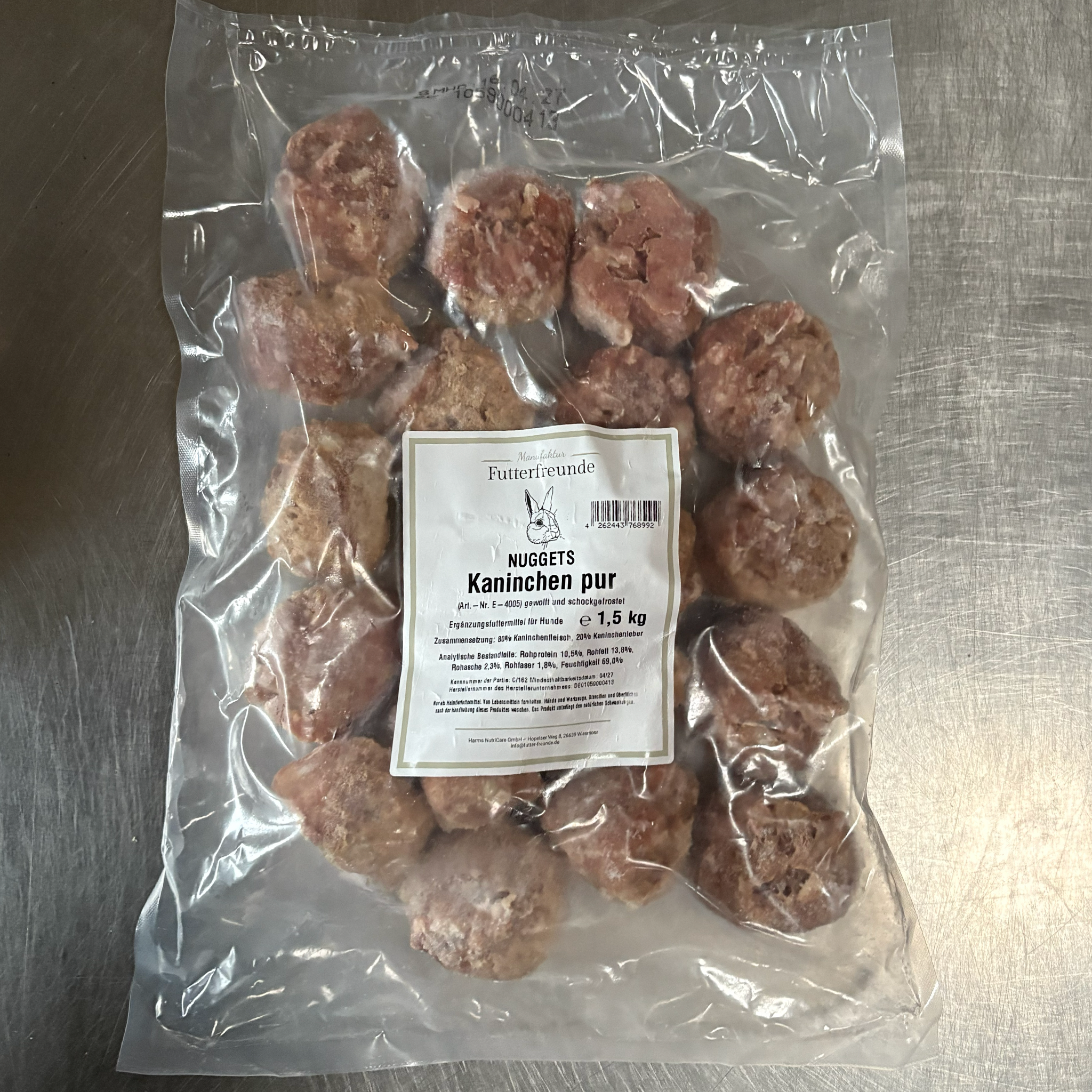 Unser Kaninchen-Menü ohne Gemüse in praktischen 75g Pellets ist eine gute Lösung für eine natürliche und ausgewogene BARF-Ernährung Ihres Hundes. Hergestellt aus hochwertigem Kaninchen, wird das Produkt schonend verarbeitet und anschließend gefroren, um alle wichtigen Nährstoffe und Vitamine zu bewahren. Ohne Zusätze oder Konservierungsstoffe bietet unser Kaninchenmenü eine reine, proteinreiche Mahlzeit.