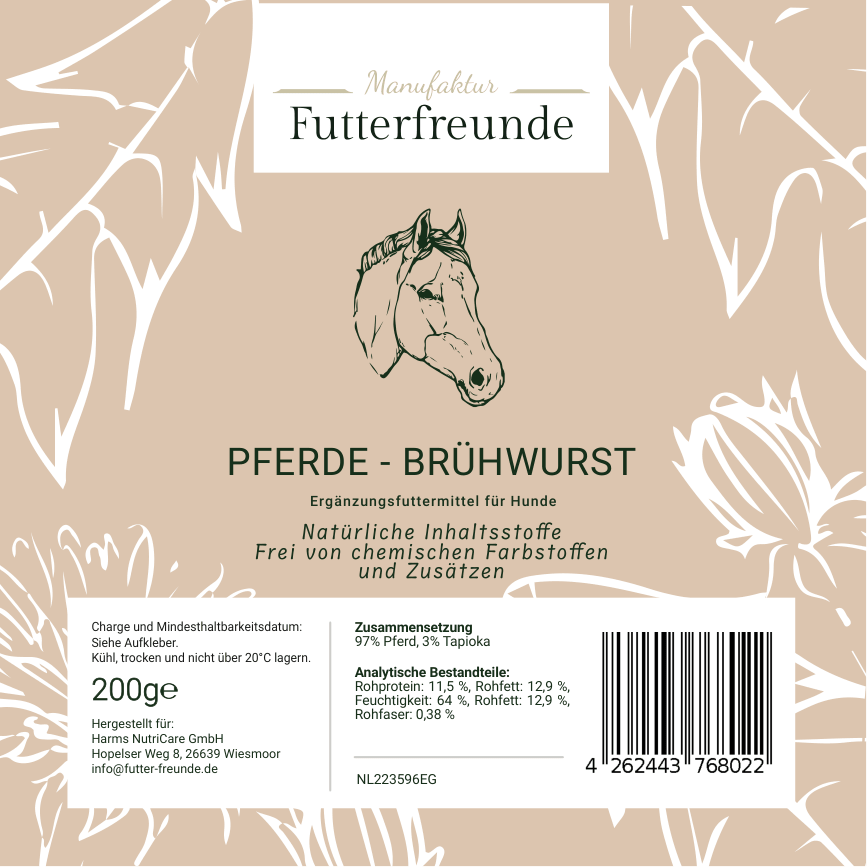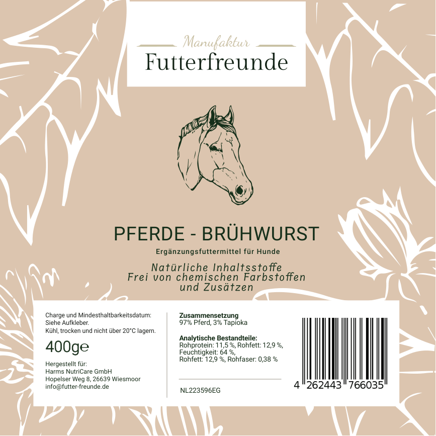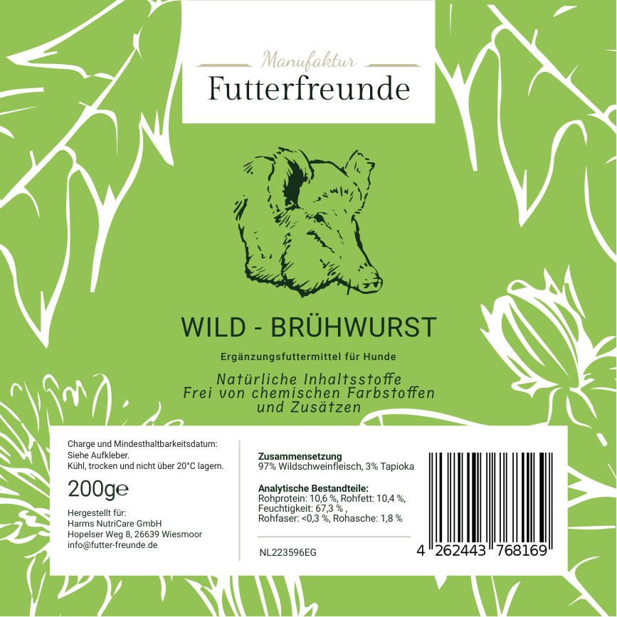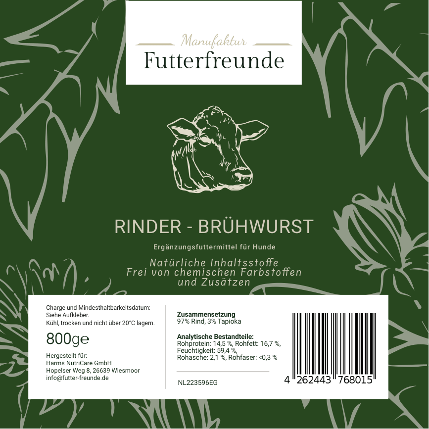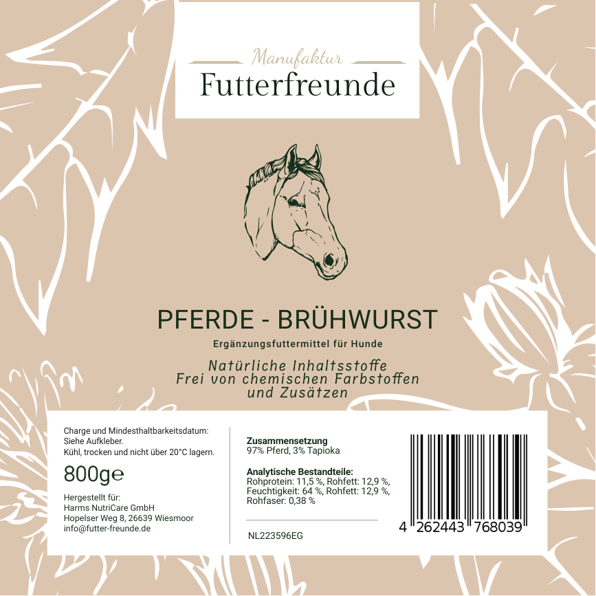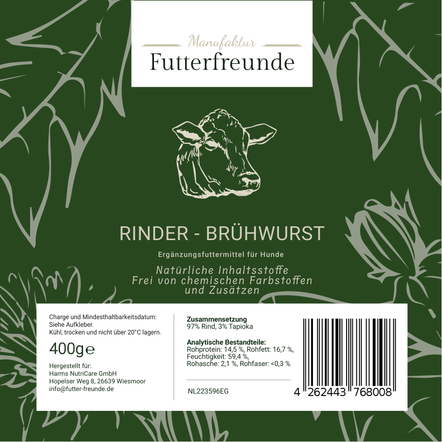 Unsere Fleischwurst ist eine schnittfeste, schonend gegarte Monoprotein-Mahlzeit für Hunde und eignet sich als Belohnung beim Training oder als praktische Alternative und Ergänzung zum BARFen – besonders unterwegs oder auf Reisen.