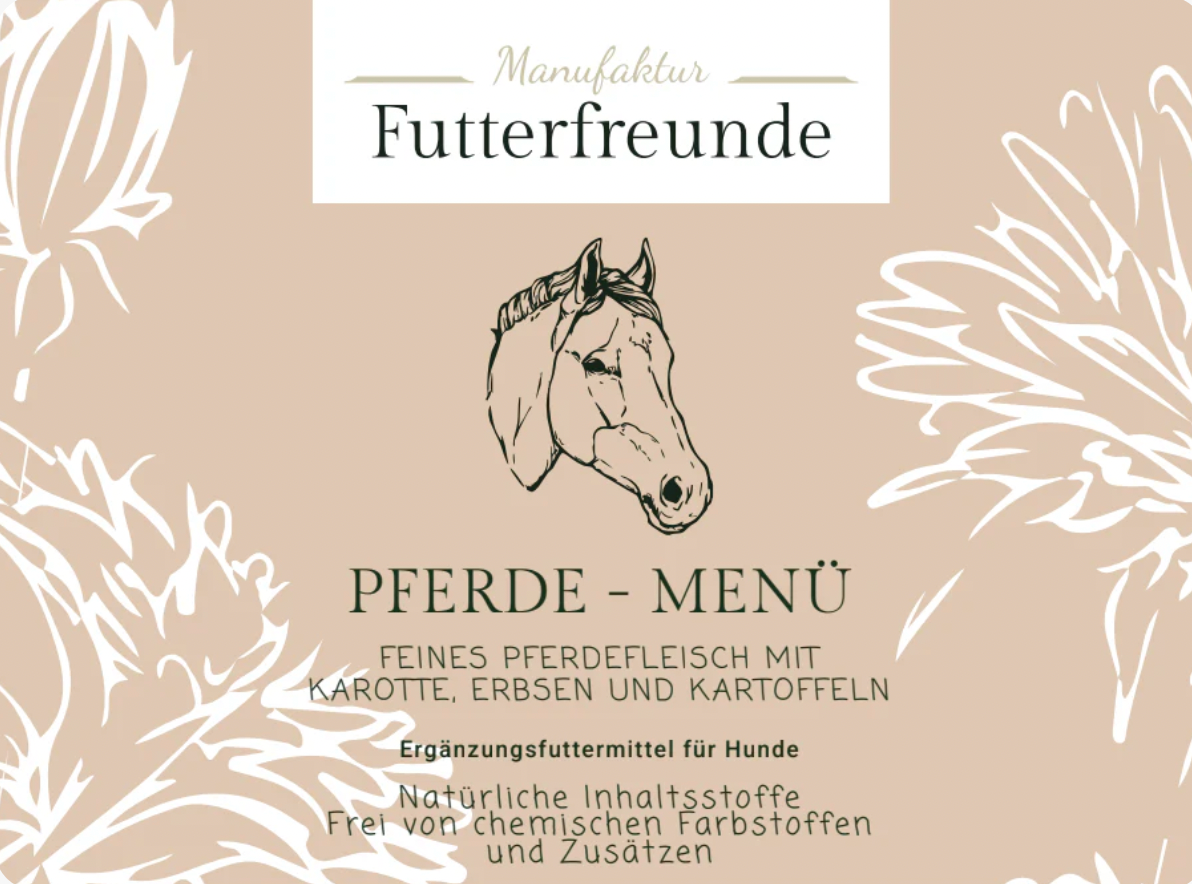 - 62 % Pferd (Pferdefleisch, Pferdeleber, Pferdeherz), 23 % Kartoffeln mit Schale, 15 % Erbsen und Karotten